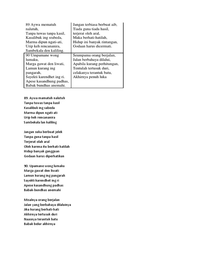 Aywa mamatuh malutuh tanpa tuwas tanpa kasil kasalibuk ing srabeda marma dipun ngati-ati urip keh rencananira sambekala den kaliling. Aywa mamatuh malutuh tanpa tuwas tanpa kasil kasalibuk ing srabeda marma dipun ngati-ati urip keh rencananira sambekala den kaliling. 90 Umpamane wong lumaku Marga gawat den liwati Lamun kurang ing pangarah Sayekti karendhet ing ri.