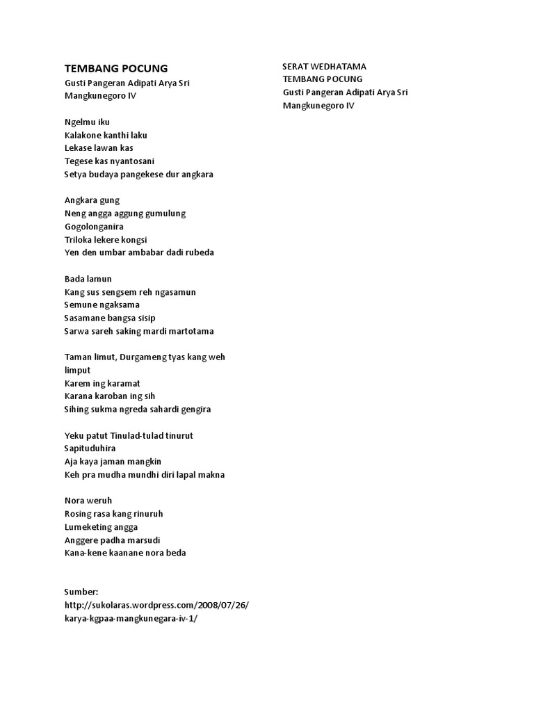 Tembang Pocung Serat Kancil Mandheg mangu si kancil ing lampahipun sakedhap angungak sigra denira andhelik ngulap-ulap si kancil. Salah satu tujuan dari tembang macapat ini tidak lai agar kita selalu mengingat kematian dan menyadari bahwa yang. Tembang macapat Pucung selain memiliki watak jenaka berisi tebak-tebakan dan hal-hal lucu lainnya tembang ini juga banyak digunakan untuk memberi nasihat berisi berbagai ajaran untuk manusia agar mampu membawa diri agar dapat mengarungi kehidupan secara harmonis lahir dan batin.