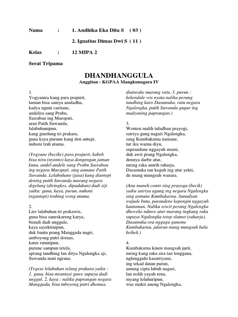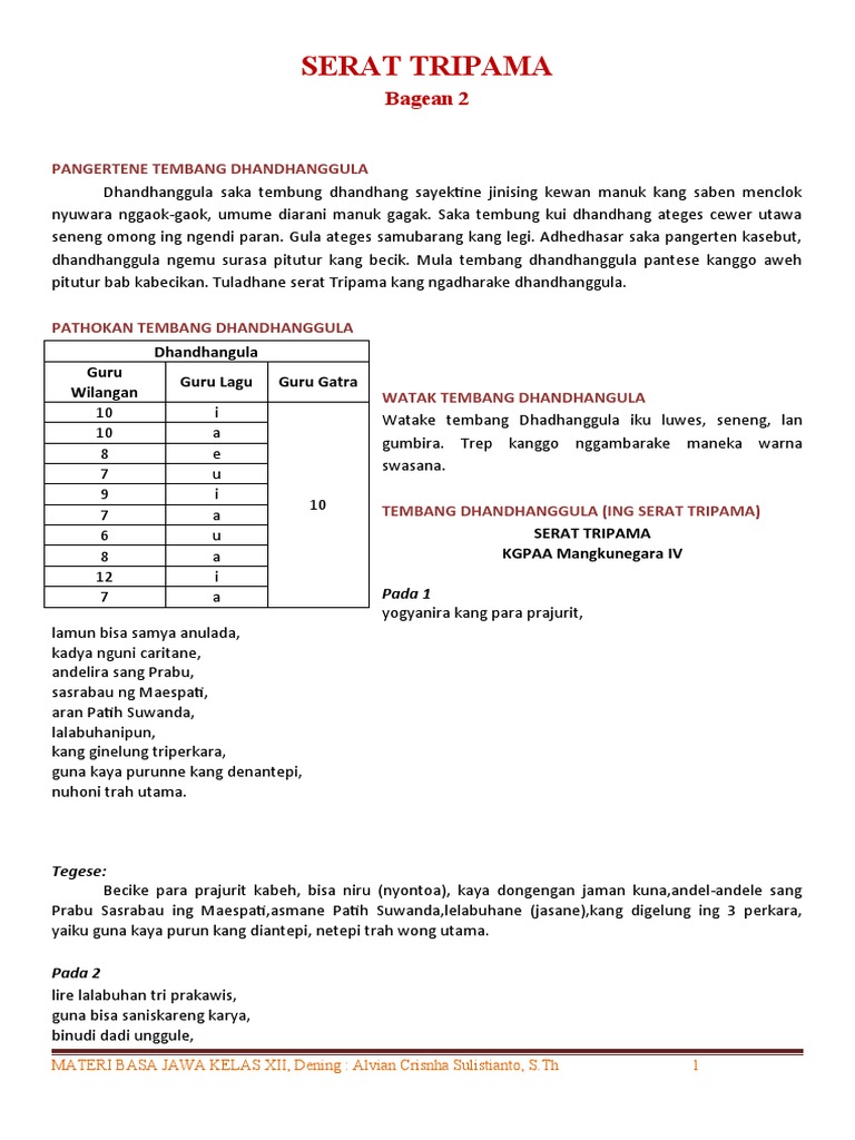 Aran Patih Suwanda lalabuhanipun kang ginelung tri prakara guna kaya purune kang den antepi nuhoni trah utama. Aran Patih Suwanda Lalabuhanipun Kang ginelung tri prakara Guna kaya purunne kang denantepi Nuhoni trah utama 1. Ma tegese utama Serat Tripama iku dianggit dening KGPAA Sri Mangkunegara IV ing tahun 1809 - 1881 M wonten Surakarta.
