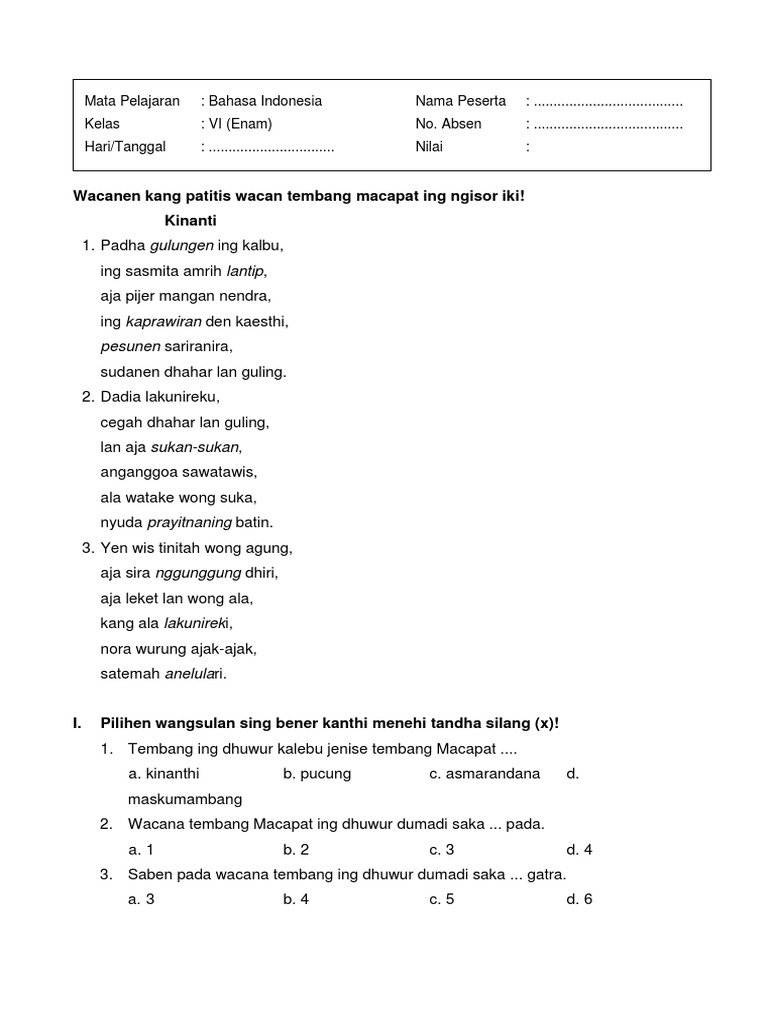 Kang matur iki pitados dhateng para Maos bilih sampun langkung pana dhateng isining piwulang ingkang sinawang ing sekar Kinanthi wau langkung lebda ing basa lan ing edining rasa lan edining surasa menggahing sekar Kinanthi sapada wau. Soal USEK Ujian Sekolah Bahasa Jawa. Dadiya lakuniraku cegah dhahar lawan guling lawan ojo sukan-sukan anganggowa sawatawis ala watake wong suka nyuda prayitnaning batin.