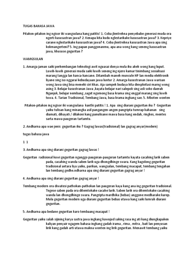 Materi purwakanthi parikan dan wangsalan - Materi Bahasa Jawa Fanny 2018-02-24T2128000700 50 stars based on 35 reviews Kawruh Kagunan Basa A. Jangan kacang jangan kara. Parikan yaiku tetembungan utawa unen-unen sing duweni pathokan utawa paugeran ajeg.