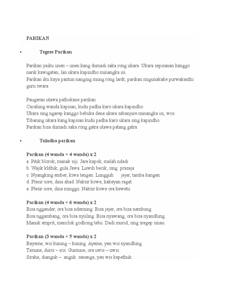 Untuk mengetahui lebih lanjut tentang hal itu berikut adalah pembahasan materi parikan dan wangsalan dalam Bahasa Jawa disertai dengan pengertian parikan dan wangsalan contoh macam serta ciri - cirinya. Tembung sekaliyan apa sekalihan. Ati bin gar mung yen mentas tampa bayar Bunga mawar bau harum semerbak Hati gembira kalau habis menerima gaji Parikan 8 wanda 8 wanda Contoh.