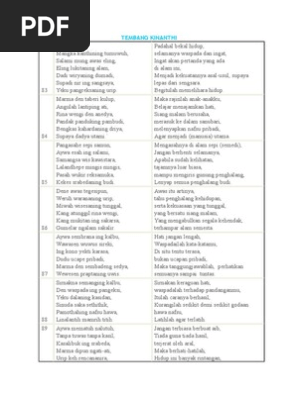 Preview this quiz on Quizizz. TEMBANG KINANTHI Umpamane wong lumaku Marga gawat den liwati Lamun kurang ing pangarah Sayekti karendhet ing ri. Sabanjure akeh wong kang omah-omah dadi kuciwa.