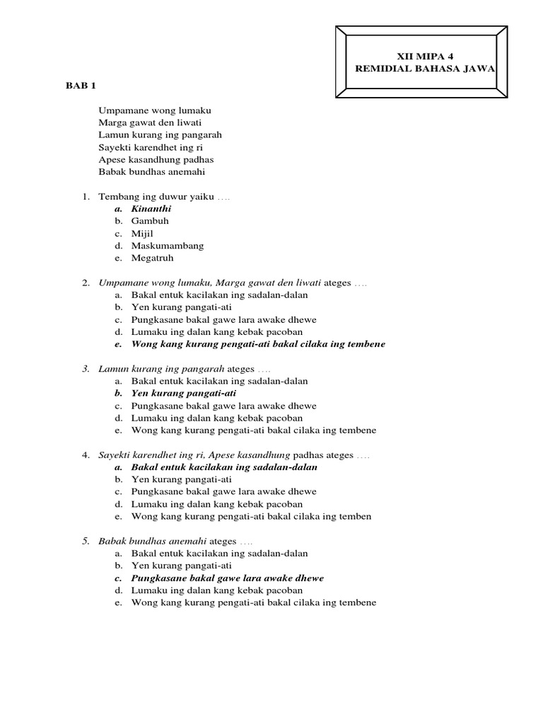 Lumrah bae yen kadyeku atetamba yen wis bucik duwea. Wong bodho kanggone mung yen kekurangan wae. Menehi dijaluk bali murungake janji kang wis diucapake.