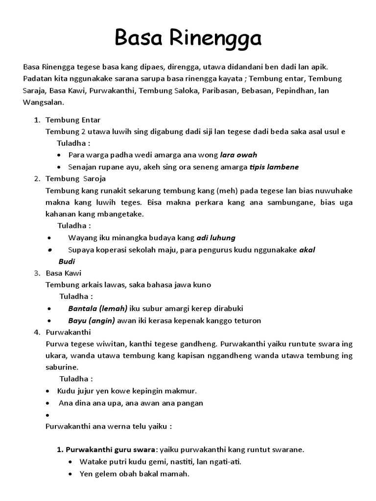 Kajaba marga endahing basa karangan katon endah marga becik pangrakite laras pangrumpakane. Basa rinengga bisa ditrapake ana ing maneka warna ragam basa gumantung karo kaperluane. Pangerten Basa Rinengga Basa Rinenga yaiku basa sing dirangkai kanthi cara tembunge digabung karo tembung liya saenga dadi basa sing endah lan nresepake ati.