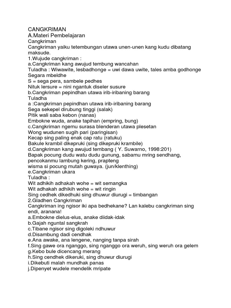 Impen kang karacik tharik-tharik samar-samar ngedoh. Materi Pembelajaran Cangkriman Cangkriman yaiku tetembunga. Mampu mendengarkan dan memahami ragam wacana lisan berupa pesan langsung dan cerita tokoh wayang.